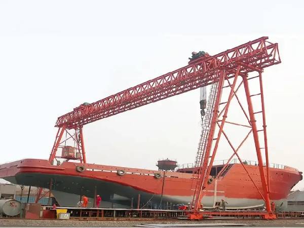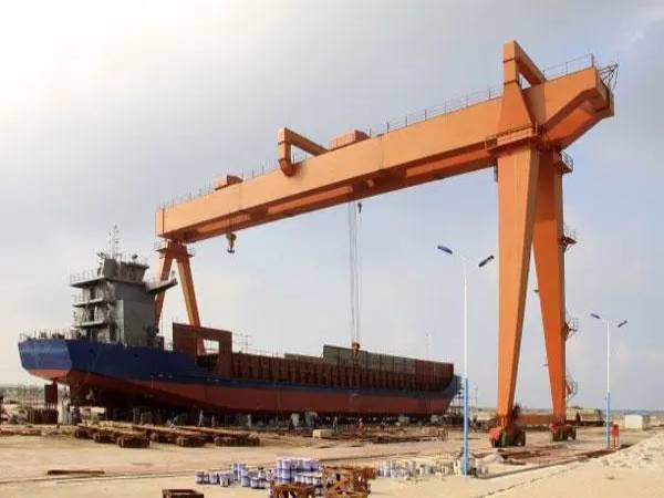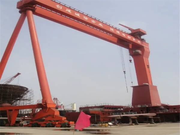 門式結構:造船門機采用門式結構,其主要特點是橫梁懸掛在兩側的立柱上,形成門形結構,從而形成一個大型的起重空間。這種結構能夠提供足夠的高度和跨度,以容納大型船舶的建造和維修需求。